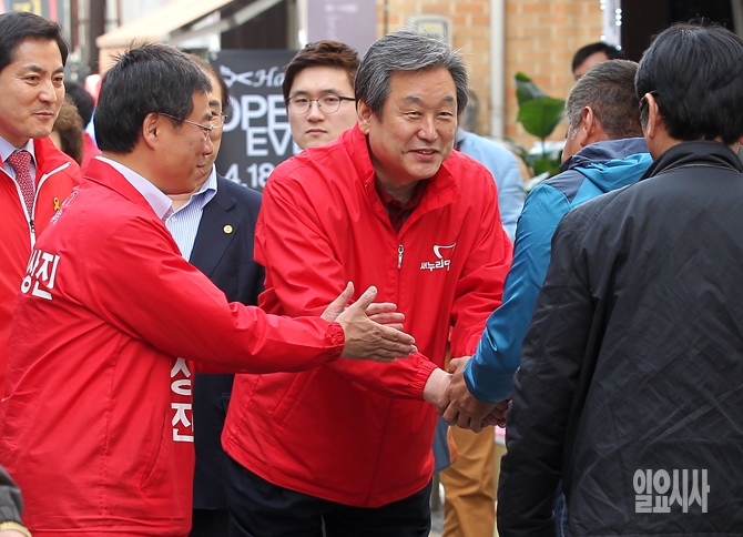 새누리당 김무성 대표가 20일 오후 경기도 성남 중원구 성남동 복지촌길에서 4·29 중원구 국회의원 재보궐선거에 출마하는 신상진 후보와 함께 시민들에게 지지를 호소하고 있다.
