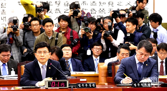 20일, 서울 여의도 국회 법제사법위원회 회의실서 열린 법사위 전체회의에서 '성완종 리스트' 관련 회의가 열린 가운데, 황교안 법무부장관이 출석해 의원들의 질의를 듣고 있다.