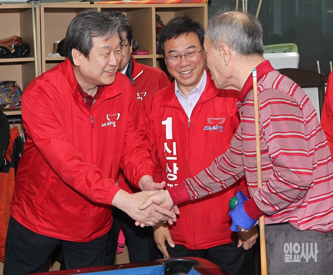 새누리당 김무성 대표가 20일 오후 경기도 성남 중원구 중원노인종합복지관에서 4·29 중원구 국회의원 재보궐선거에 출마하는 신상진 후보와 함께 어르신들에게 지지를 호소하고 있다.