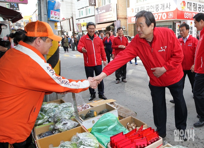 새누리당 김무성 대표가 20일 오후 경기도 성남 중원구 성남동 복지촌길에서 4·29 중원구 국회의원 재보궐선거에 출마하는 신상진 후보와 함께 상인들에게 지지를 호소하고 있다.