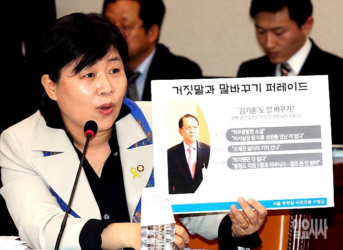 20일, 서울 여의도 국회 법제사법위원회 회의실서 열린 법사위 전체회의에서 '성완종 리스트' 관련해 새정치민주연합 서영교 의원이 김기춘 전 청와대 대통령실장과 관련해 질의하고 있다.