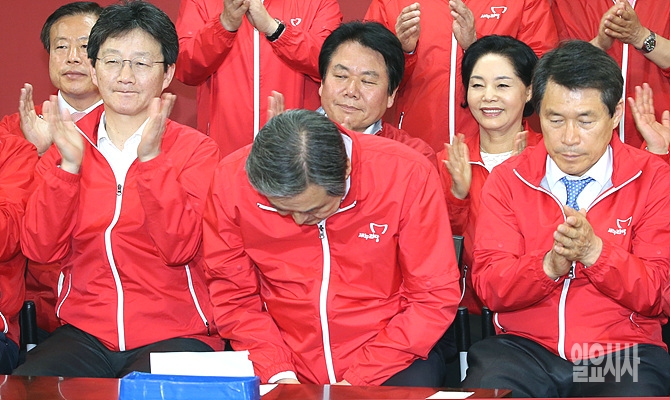 29일, 서울 여의도 새누리당 당사에서 4·28재보선 선거결과 방송을 지켜보던 김무성 대표가 결과를 지켜보다가 새누리당 후보들이 선전하고 있자 고개를 숙여 감사 인사를 하고 있다.