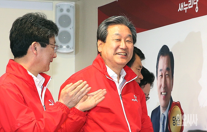 29일, 서울 여의도 새누리당 당사에서 4·28재보선 선거결과 방송을 지켜보던 김무성 대표가 4석 중 3석을 확보하는 것으로 나오자 활짝 웃고 있다.