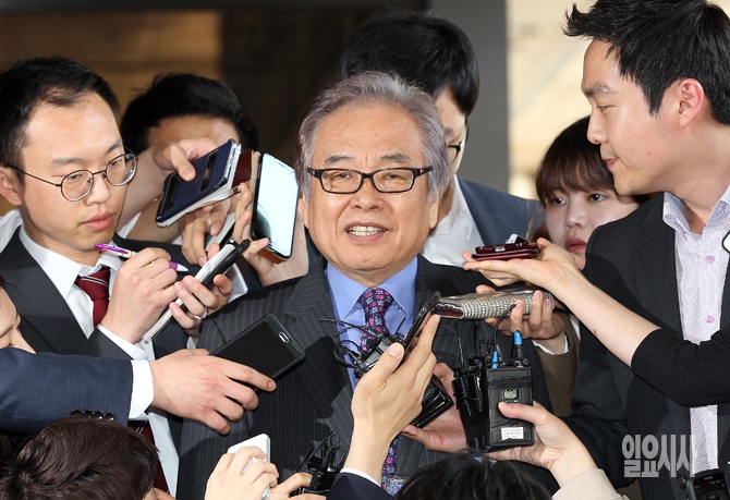 '중앙대 특혜' 외압 의혹을 받고 있는 박범훈 전 청와대 교육문화수석이 30일 오전 서초동 서울중앙지검에 피의자 신분으로 출석해 취재진의 질문을 받고 있다.