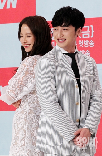 배우 송지효와 변요한이 30일 오후 서울 영등포 타임스퀘어 아모리스홀에서 열린 TvN 금토 드라마 <구여친클럽> 제작발표회에서 포즈를 취하고 있다.