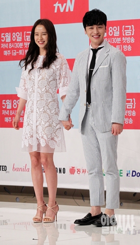 배우 송지효, 변요한이 30일 오후 서울 영등포 타임스퀘어 아모리스홀에서 열린 TvN 금토 드라마 <구여친클럽> 제작발표회에서 포즈를 취하고 있다.