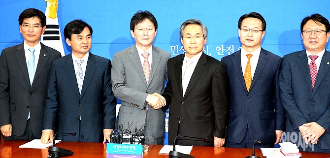 4일, 서울 여의도 국회에서 유승민·우윤근 여야 원내대표, 조해진·안규백 여야 원내수석부대표 등 지도부가 '2+2 여야 주례회동' 직전, 악수를 나누고 있다.