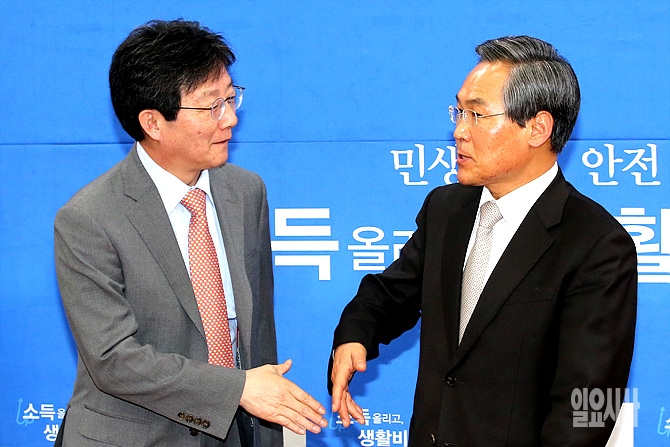 4일, 서울 여의도 국회에서 유승민·우윤근 여야 원내대표가 '2+2' 주례회동 직전, 악수를 나누고 있다.