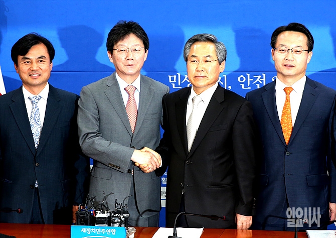 4일, 서울 여의도 국회에서 유승민·우윤근 여야 원내대표, 조해진·안규백 여야 원내수석부대표 등 지도부가 '2+2' 주례회동 직전, 악수를 나누고 있다.