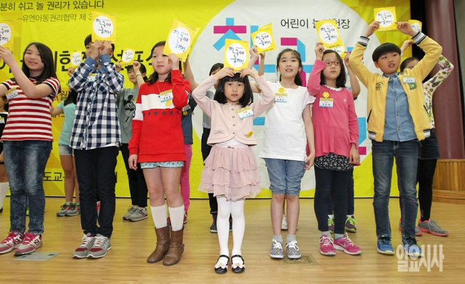 어린이날을 하루 앞둔 4일 오전 서울 여의도 국회의원회관에서 어린이들이 '어린이 놀이 헌장'이 적힌 종이를 들어보이고 있다.
