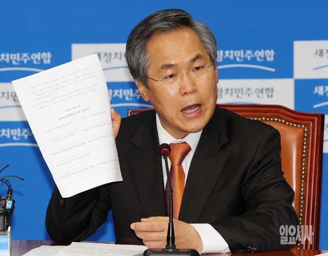 새정치민주연합 우윤근 원내대표가 6일 오전 서울 여의도 국회에서 열린 최고위원회의에서 공무원연금개혁 실무기구 합의안을 보여주며 발언하고 있다.