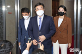 [포토] 언론중재법 여야 합의 오리무중...홀로 의장실 나서는 윤호중