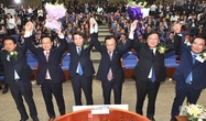 [포토] 꽃다발 든 신임 민주당 원내지도부와 이해찬 대표