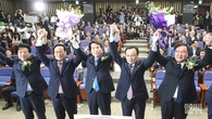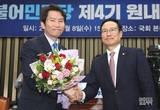 [포토] “잘해봅시다” 꽃다발 든 신임 민주당 원내지도부 및 이해찬 대표
