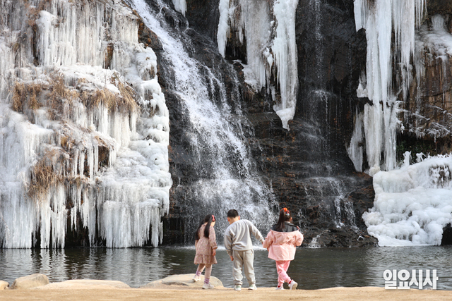 [포토] ‘추위도 잊고’...아이들 발길 붙잡은 얼어붙은 인공폭포