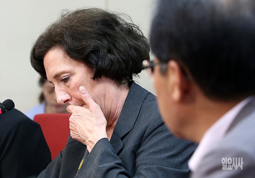 수잔 솔티 북한자유연합 대표가 30일, 서울 여의도 당사에서 홍준표 자유한국당 대표와 환담 도중 잠시 생각에 잠겨있다.