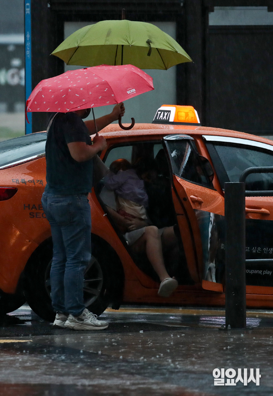 장마전선의 영향으로 수도권 지역에 호우특보가 발령된 13일 오후 서울 용산역 앞을 지나는 시민들이 발걸음을 재촉하고 있다.