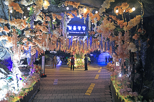 길 이름도 바람길이다. 바람 따라 광부들의 곡괭이질 소리가 들리는 듯하다. 100m쯤 걸으면 웜홀광장이 나온다. 치렁치렁 늘어진 꽃 조형물과 장식품, 은근한 조명이 어울려 포토존 역할을 한다. 빛의공간은 더 화려하다. 발광다이오드(LED) 조명과 뉴미디어 기법으로 아름답게 반짝인다.