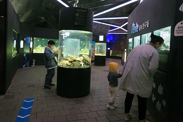 동굴아쿠아월드는 광명동굴의 암반수로 채운 아쿠아리움이다. 황금물고기(금룡), 피라냐, 문피시 등이 수조를 누빈다. 배 속이 훤히 비치는 글라스캣피시는 아이들에게 인기가 많다.