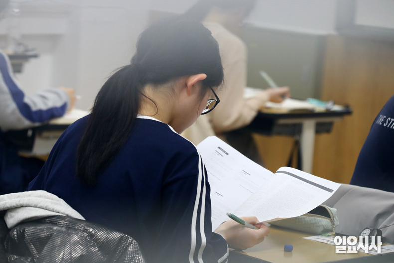 2024학년도 대학수학능력시험이 치러지는 16일 서울 중구 이화여자외국어고등학교에서 수험생들이 시험 전 마지막 준비를 하고 있다.