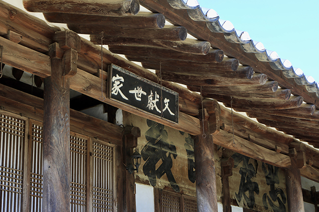 문헌은 나라서 내린 시호다. 일두고택에 있는 여러 글씨 중 압권은 사랑채 방문 위에 붙은 충효절의(忠孝節義)다. 커다란 종이에 거침없이 쓴 글자에 기백이 흐르는 듯하다. 넓게 자른 나무판자가 아니라 종이에 써서 색이 바래고 해진 흔적마저 오랜 세월의 증거처럼 느껴진다.