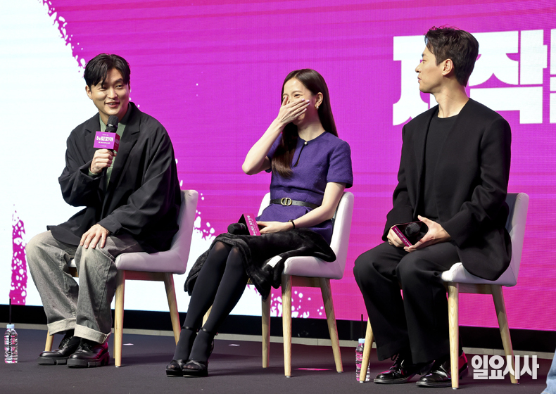 배우 박정민과 지수가 7일 서울 여의도 콘래드 서울 호텔에서 열린 쿠팡플레이 <뉴토피아> 제작발표회에서 포토타임 중 대화를 나누고 있다.
