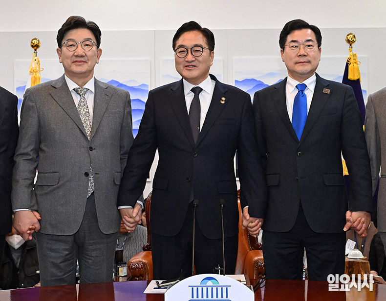 우원식 국회의장과 국민의힘 권성동·더불어민주당 박찬대 원내대표가 6일 오후 서울 여의도 국회의장실에서 열린 국정협의체에 참석하고 있다.