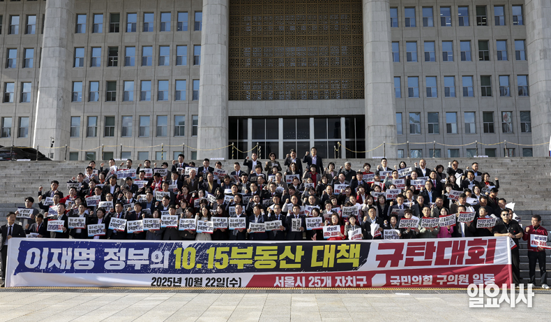 국민의힘 서울시당 소속 기초의원들이 22일 오후 서울 여의도 국회 본청 앞 계단에서 열린 '이재명 정부 10.15 주거 재앙 규탄대회'에서 피켓을 들고 있다.