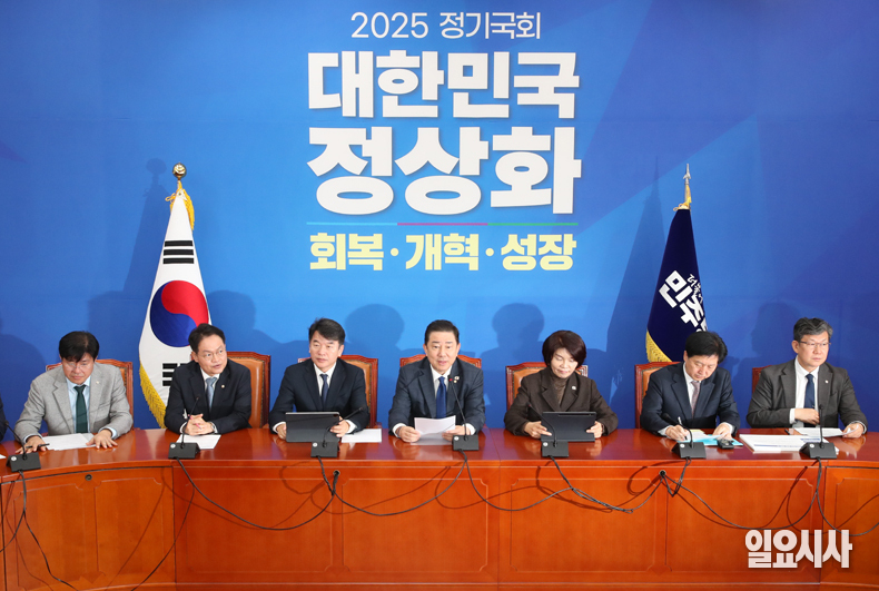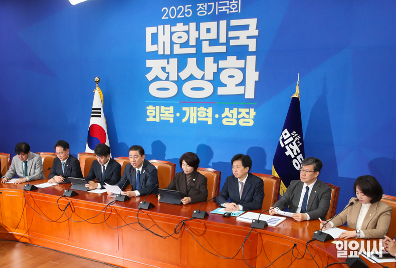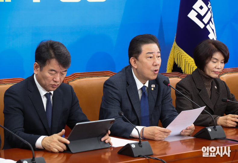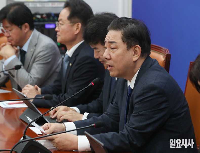 민주당 김병기 원내대표가 25일 오전 서울 여의도 국회에서 열린 원내대책회의에서 발언하고 있다.