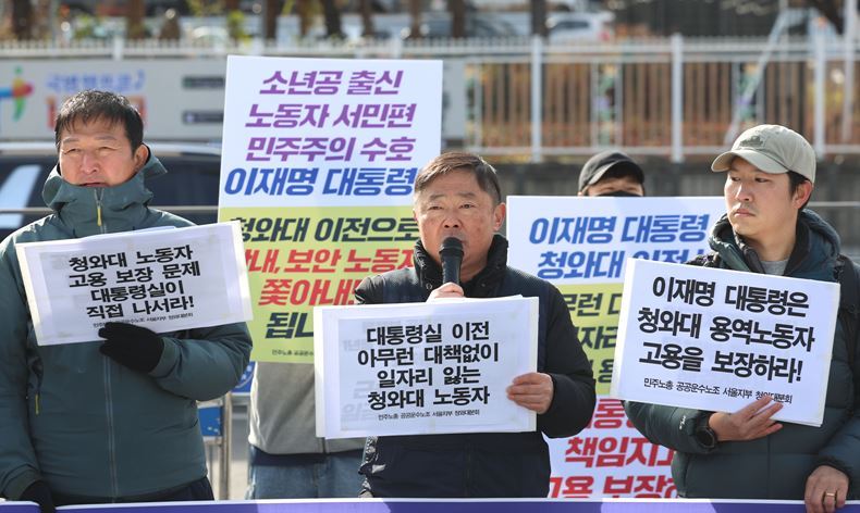 공공운수노조 서울지역공공서비스지부는 지난달 17일 서울 용산 대통령실 앞에서 기자회견을 열고, 해고 위기에 놓인 청와대 용역 노동자들의 고용 보장을 촉구했다.