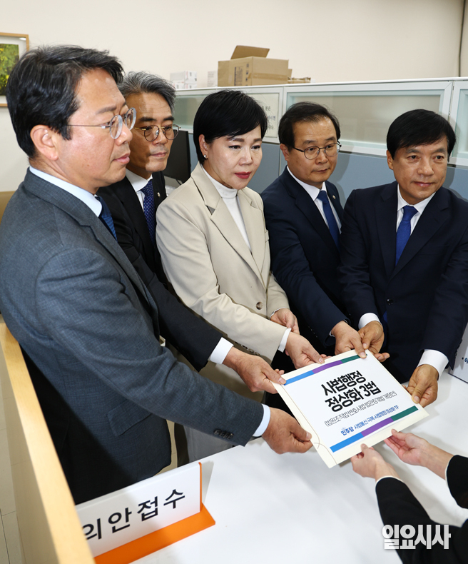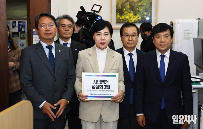 더불어민주당 전현희 사법불신 극복·사법행정 정상화 TF 위원장과 의원들이 3일 오후 서울 여의도 국회 의안과에서 사법행정 정상화 3법을 제출하고 있다.