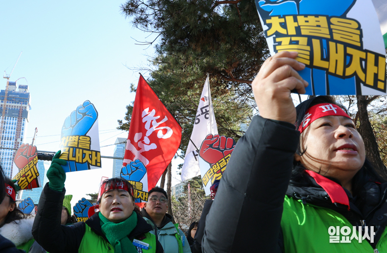 전국학교비정규직노동조합, 전국교육공무직본부, 전국여성노동조합으로 구성된 전국학교비정규직연대회의가 5일 오후 서울 여의도 국회 앞에서 열린 ‘전국학교비정규직연대회의 2차 총파업 대회’에서 구호를 외치고 있다.
