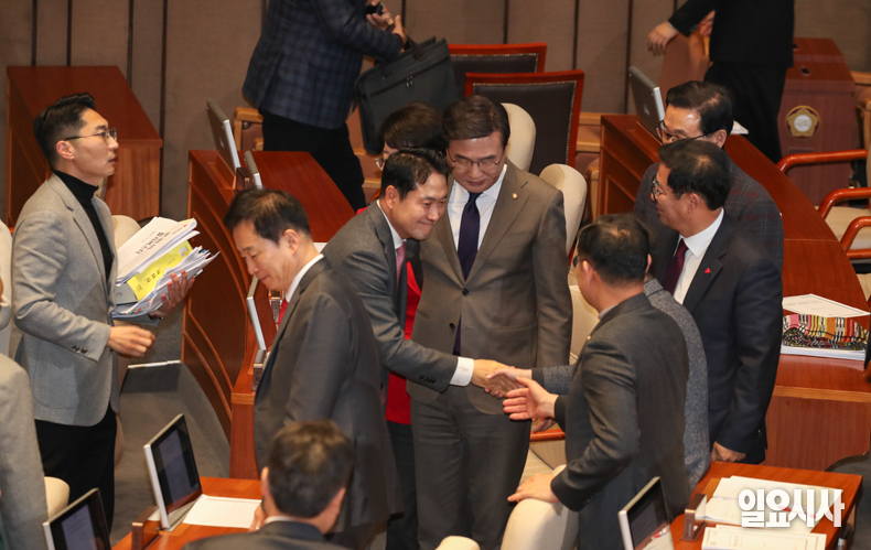 국민의힘 장동혁 대표가 23일 오전 서울 여의도 국회에서 열린 제430회 국회(임시회) 제2차 본회의에서 필리버스터(무제한 토론)가 강제 종결되면서 발언대에서 내려와 의원들의 격려를 받으며 이동하고 있다.