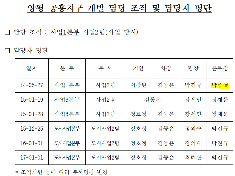 더불어민주당 한준호 의원이 대한토지신탁에서 제출받은 자료에 따르면, 박종철 대한토지신탁 대표는 2014년 5월27일 양평 공흥지구 사업 담당자였던 것으로 확인됐다. 당시 박 대표는 대한토지신탁 사업1본부장으로 근무하다가 2018년 12월 퇴사했다. 2019년과 2020년에는 에이치에스파트너스그룹 사장과 비전알이 대표이사를 역임했다.