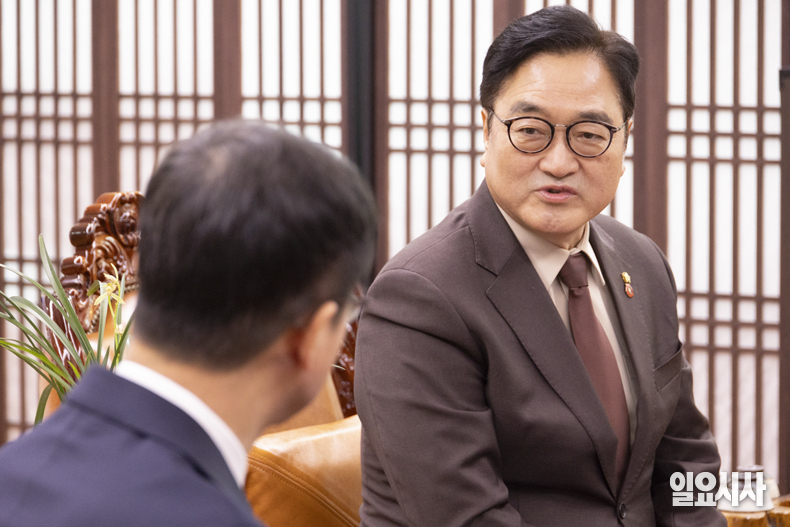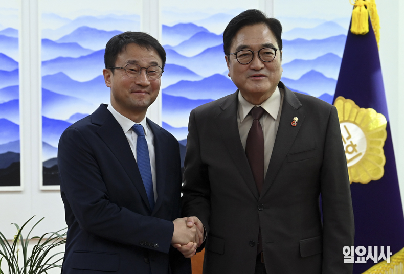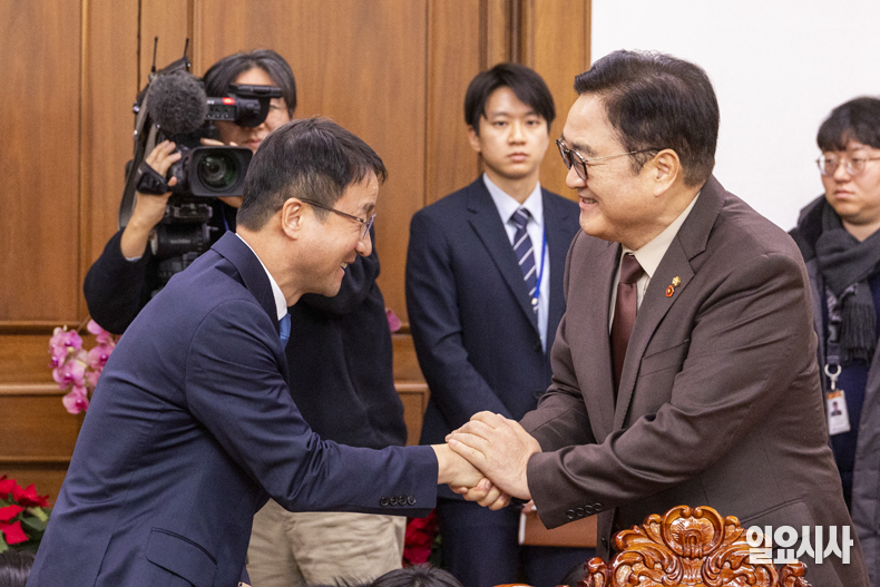 더불어민주당 한병도 신임 원내대표(왼쪽)가 12일 오전 서울 여의도 국회의장실에서 우원식 국회의장을 예방해 인사를 나누고 있다.