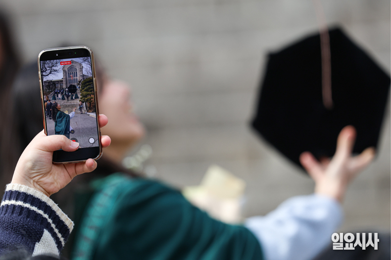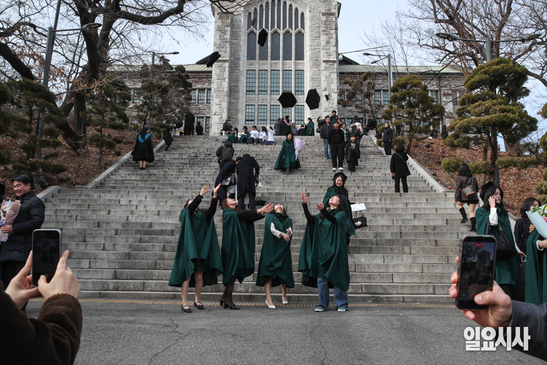 23일 오후 서울 서대문구 이화여자대학교에서 열린 2025학년도 전기 학위수여식에서 졸업생들이 학사모를 던지고 있다.