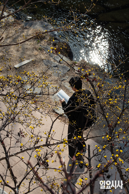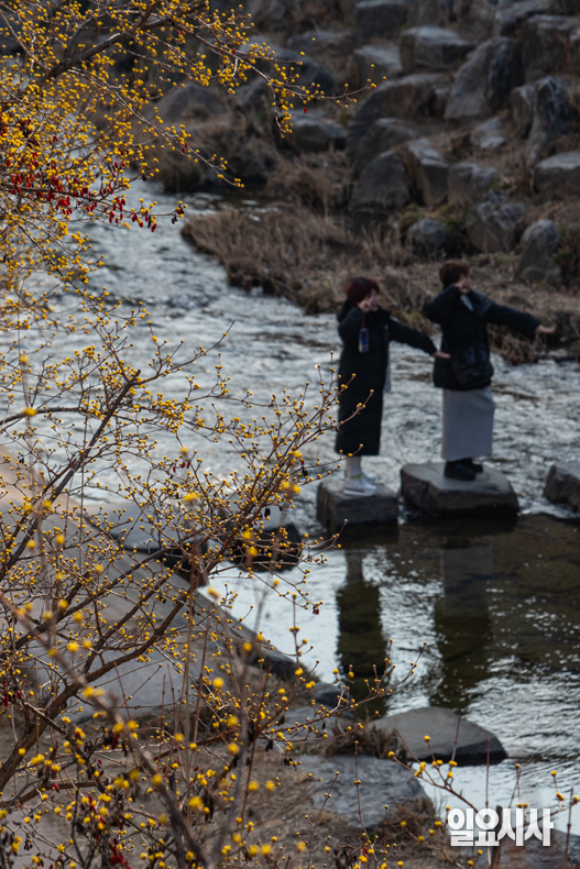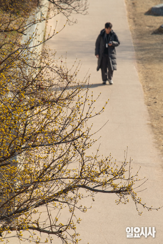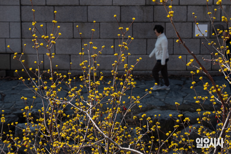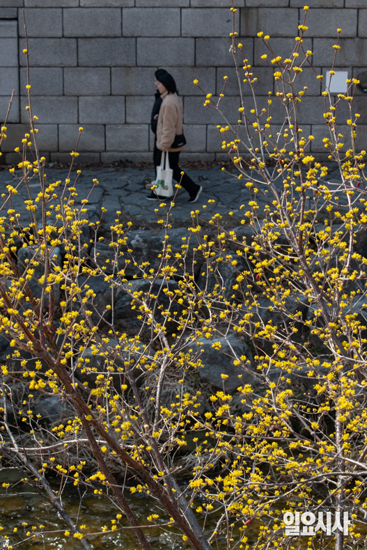 영하권 추위가 이어지고 있는 가운데 10일 오전 서울 종로구 청계천 인근에 피어있는 산수유 꽃 주변으로 시민들이 이동하고 있다.