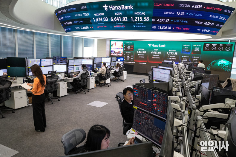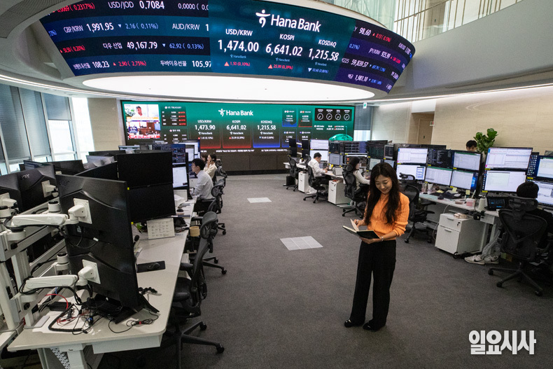 코스피가 상승 출발해 장중 최고치를 다시 경신한 가운데 28일 오후 서울 하나은행 본점 딜링룸에서 직원이 증시와 환율 등을 모니터하고 있다.