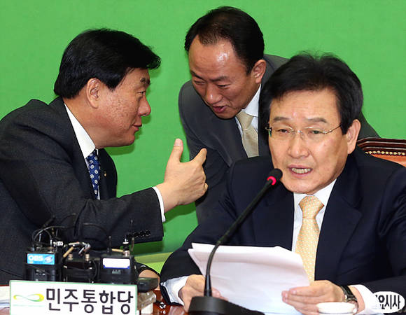 민주통합당 박기춘 원내대표(사진 왼쪽)가 12일 오전 서울 여의도 국회 원내대표실에서 열린 원내대책회의에서 김명진 비서실장과 대화를 나누고 있다.
