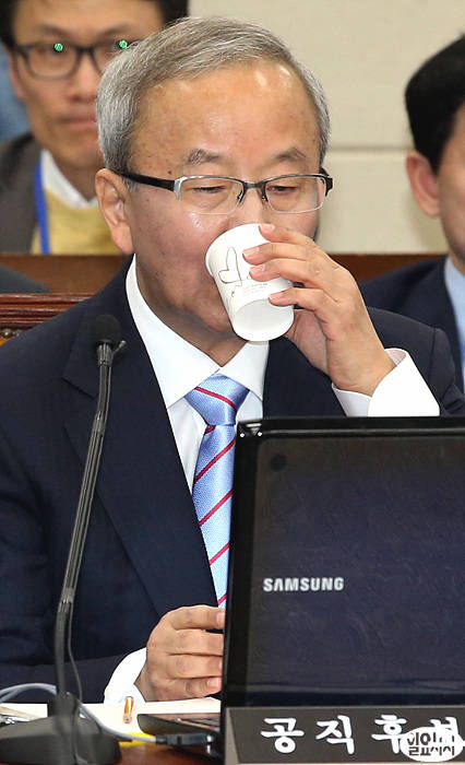 현오석 경제부총리 겸 기획재정부장관 내정자가 13일 오전 국회에서 열린 인사청문회에 출석해 청문회 도중 목이 타는 듯 물을 마시고 있다.