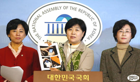 지난 22일, 국회 본회의 도중 여성 나체 사진을 감상해 논란을 일으키고 있는 새누리당 심재철 최고위원에 대해 민주통합당 여성의원들이 25일, 심 의원의 윤리특별위원회의 사퇴를 주장하고 있는 가운데, 서영교 의원(사진 중앙) 등이 심 의원의 스마트폰이 찍힌 사진을 들어보이고 있다.