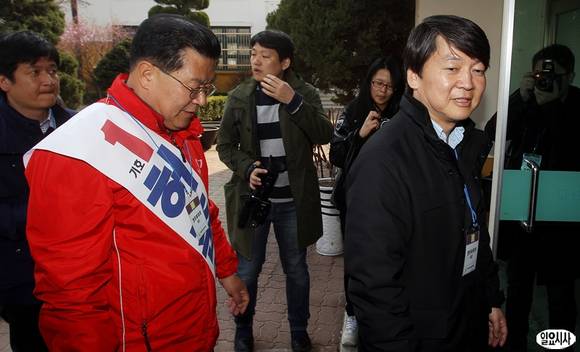 4ㆍ24 서울 노원병 국회의원 보궐선거에 출마한 허준영 새누리당 후보(왼쪽)와 안철수 무소속 후보가 3일 오후 서울 노원구 계상초등학교 녹색어머니회 발대식에 참석하고 있다.
