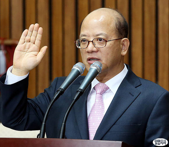 박한철 헌법재판소장 후보자가 8일 오전 서울 여의도 국회에서 열린 인사청문회에서 성실한 답변을 하겠다며선서하고 있다.