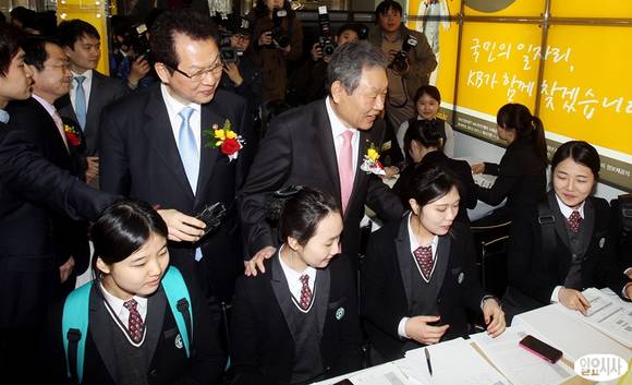 15일 오전 서울 삼성동 코엑스에서 열린 '2013 KB굿잡 우수기업 취업박람회'에서 서남수 교육부장관(왼쪽)과 어윤대 KB금융지주 회장이 취업생들을 격려하고 있다.