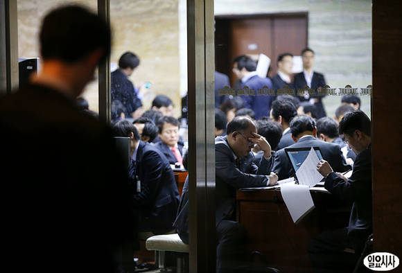 16일 오후, 국회 상임위 각 부처 해당 관계자들이 회의실 인근에 마련된 로비에서 상임위 회의가 끝나기를 기다리고 있다.