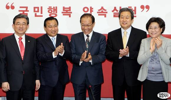 4.24 재보선에서 당선된 새누리당 김무성,이완구 의원이 26일 오전 새누리당 황우여 대표 최고위원실을 찾아 황 대표와 박수를 치고 있다. 왼쪽부터 이한구 원내대표, 이완구 의원, 황우여 대표, 김무성 의원, 이혜훈 최고위원.