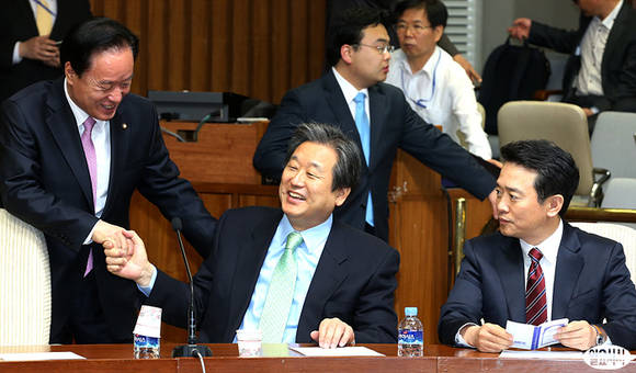 1일 오전, 국회에서 열린 새누리당 최고중진연석회의에서 김무성 의원(사진 가운데)과 이병석 의원(사진 왼쪽)이 악수를 나누고 환하게 웃고 있다.