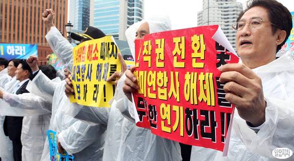대한민국 재향군인회와 호국보훈안보단체연합회 회원들이 2일 오후 서울역광장에서 열린 '전작권 전환 및 한미연합사 해체 연기 촉구 국민대회'에 참석해 구호를 외치고 있다.