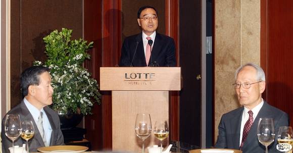 정홍원 국무총리가 2일 오후 서울 소공동 롯데호텔에서 열린 전경련 회장단 회의 만찬회에서 인사말을 하고 있다. 사진 왼쪽부터 허창수 전경련 회장, 정홍원 총리, 이준용 대림산업 회장.