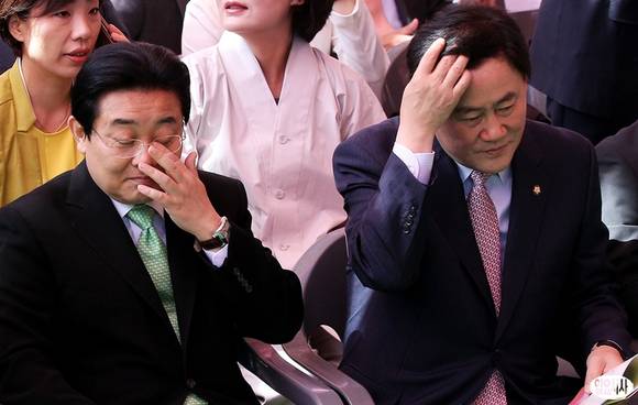 부처님 오신 날인 17일 오전 서울 종로구 조계사에서 열린 불기 2557년 봉축법요식에 참석한 최경환 새누리당 원내대표(오른쪽)와 전병헌 민주당 원내대표가 머리를 만지고 있다.